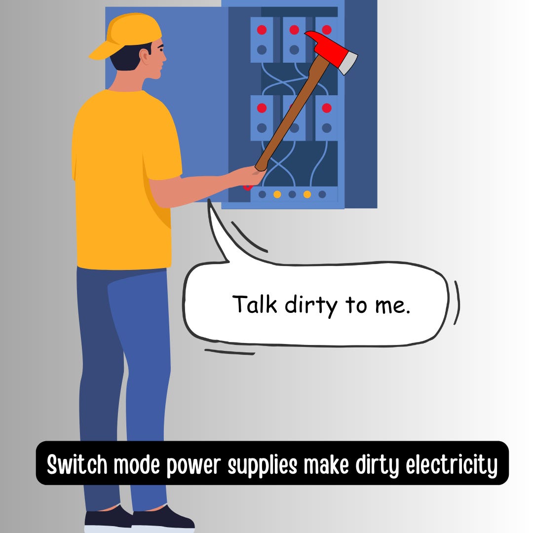 Switch mode power supply regulates voltage more precisely by converting AC to DC electricity, but to do this it has to interrupt the electrical current flow up to hundreds of thousands of times per second. When an AC field is converted to DC, this creates electrical pollution known as dirty electricity which then flows back into the grid.