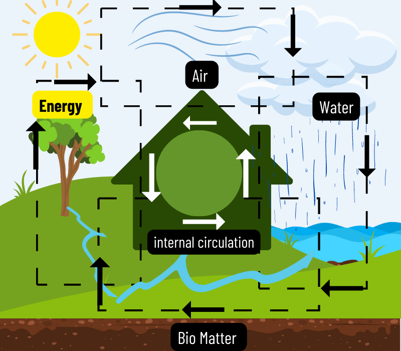 Building Biology is a study of how each element interacts and cycles with the next in its natural sequence. For example, the Sun’s energy (fire) is stored by nature in wood, plants, oil, and natural gas. When burned, this energy is released into the air. The air then carries it down to the water, then to the Earth.