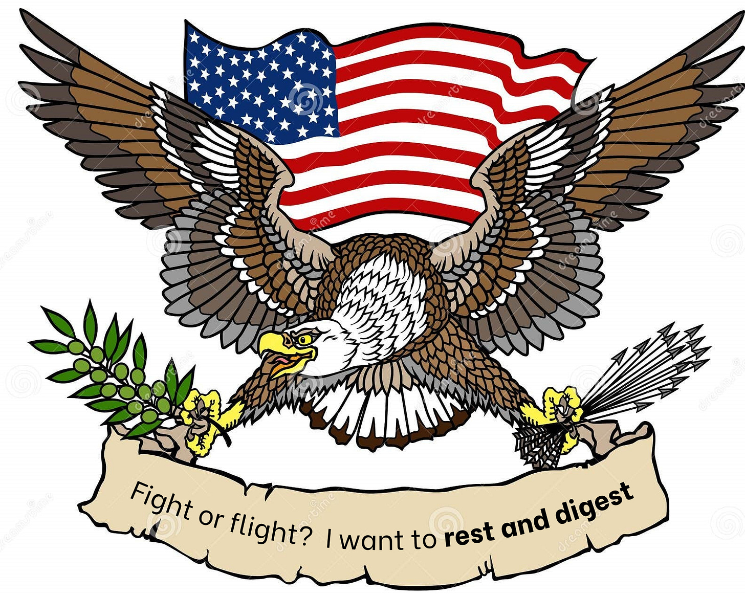 Our autonomic nervous system is divided into two major branches - the sympathetic and parasympathetic. Many of us are stuck in the sympathetic (fight/flight mode) of survival, and have difficulty activating our parasympathetic (rest/digest). Even eagles need to stop and eat from the olive branch once in a while, instead of always dive-bombing into stress.