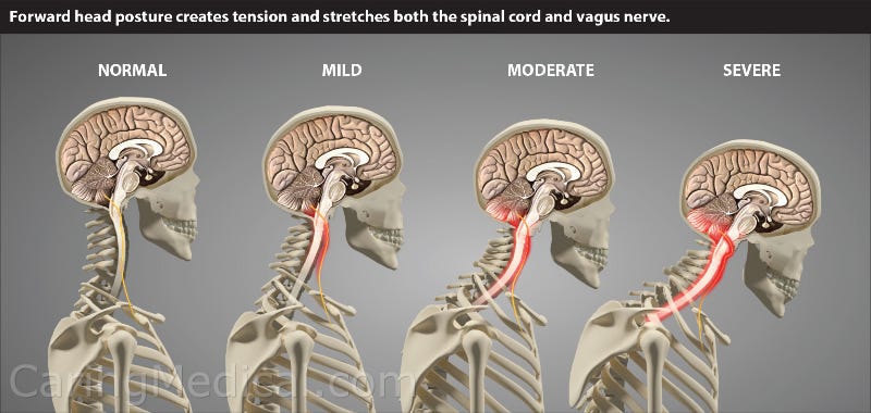 In technological age, many of us are turning into hunchbacks. Not only is this not a good look, this arcing puts pressure and added stress on our vagus nerve. Could this be why so many teens and others who are on their phones all the time say they have anxiety?