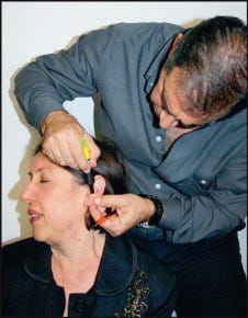By focusing in on the needle points that Helms used in his auricular trauma protocol, Dr. Asis and my colleague Ms. Symington are able to use light in the same areas to help the healing process begin.