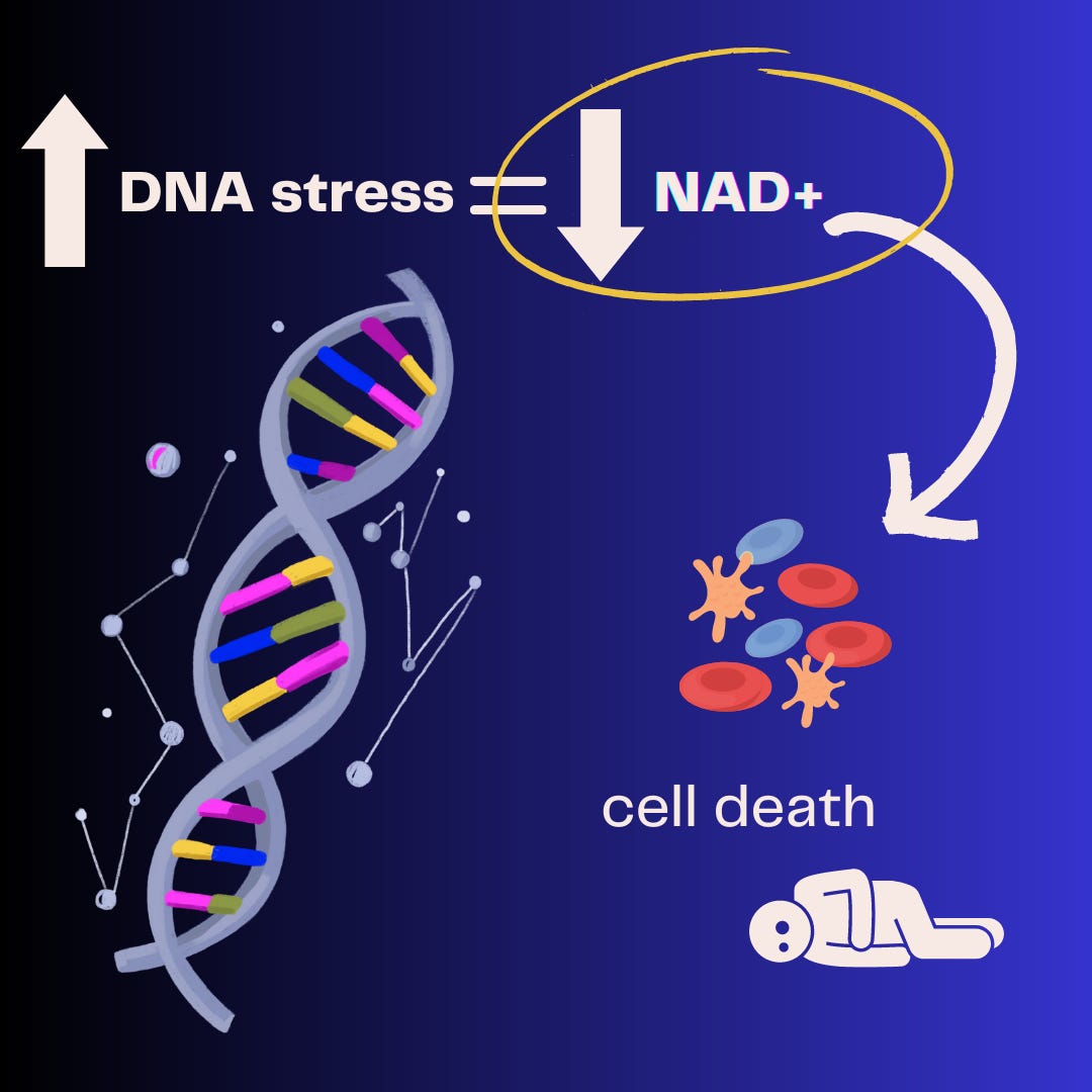 However there’s a caveat: every time we have a DNA break, our PARP enzymes drain stores of NAD+, which are necessary for DNA repair. If our DNA is stressed too much, we become deficient in NAD+, which ultimately leads to cell death.