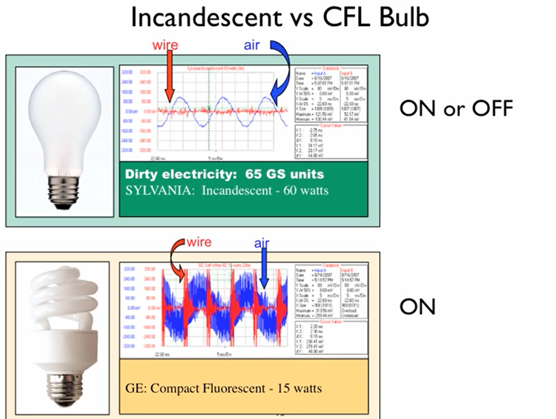 This is in stark contrast to technology before 1970. For instance, incandescent light bulbs emit what are called linear loads, which is a smooth sine wave. This waveform is much more coherent. The distorted waves we have today contribute to the phenomenon of dirty electricity, otherwise known as electromagnetic interference.