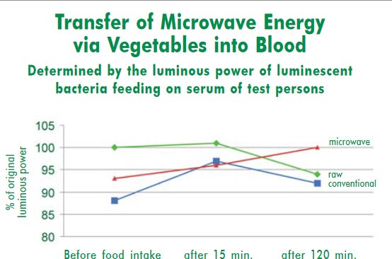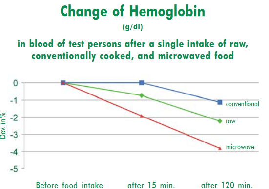 In the early 1990s, Swiss scientists Dr. Hans U. Hertel and Dr. Bernard Blac, Professor at the Federal Institute for Technology of Lausanne, showed that “an inductive transfer of radiation-energy”. . . via irradiated food into living organisms also occurs. Hertel found abnormal changes in the blood, which coincides with what other researchers are now finding - a decrease in hemoglobin12 in those who eat microwaved food.