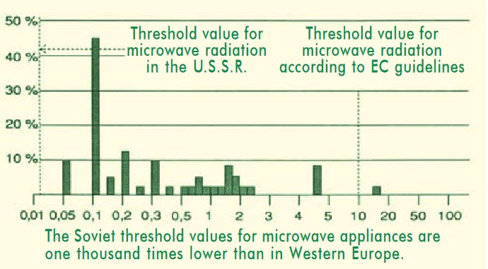 As far back as the 1930s, Russian scientists had already conducted research5 on the effects of microwaves on the nervous systems of humans and animals. Their findings led to very strict safety measures which weren’t taken seriously by western scientists, who use threshold values a thousand times higher than those of the Russians.