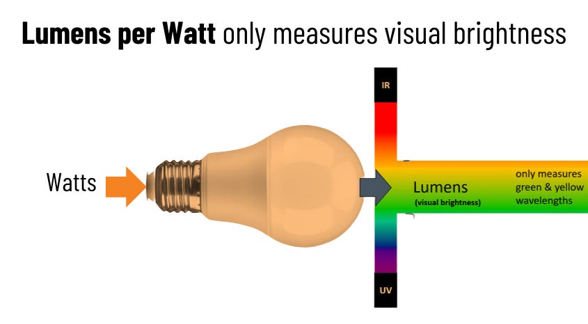 The current DOE regulations are based on standards set over one hundred years ago in 1924, and based on a measure of brightness called lumens. The light you buy at the store is rated in lumens per watt (L/W). Watts are a measure of power. The lumens we receive today from a typical LED bulb only give us light in the color spectrum of green and yellow, while depriving us of all the colors of the rainbow: