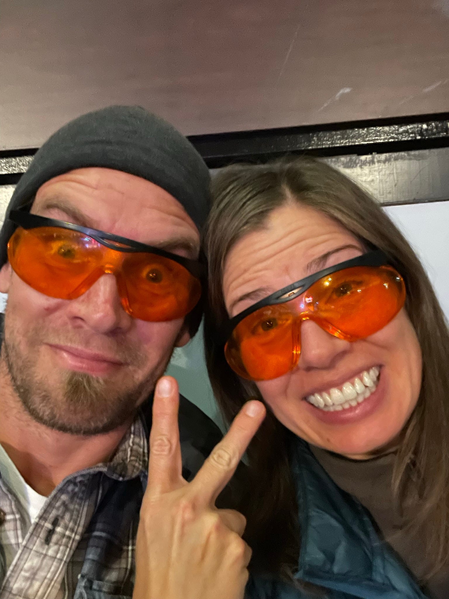 At night we wear amber-red glasses which block all of the blue spectrum. However we don’t advise wearing red glasses during the day, and especially if you’re riving, as our melatonin begins to kick in after two hours and makes uss sleepy.