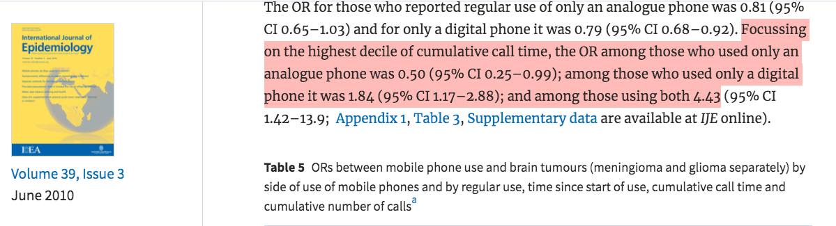 Participants who used cell phones the most were shown to have 4x the odds of developing brain cancer. (OR= Odds Ratio):