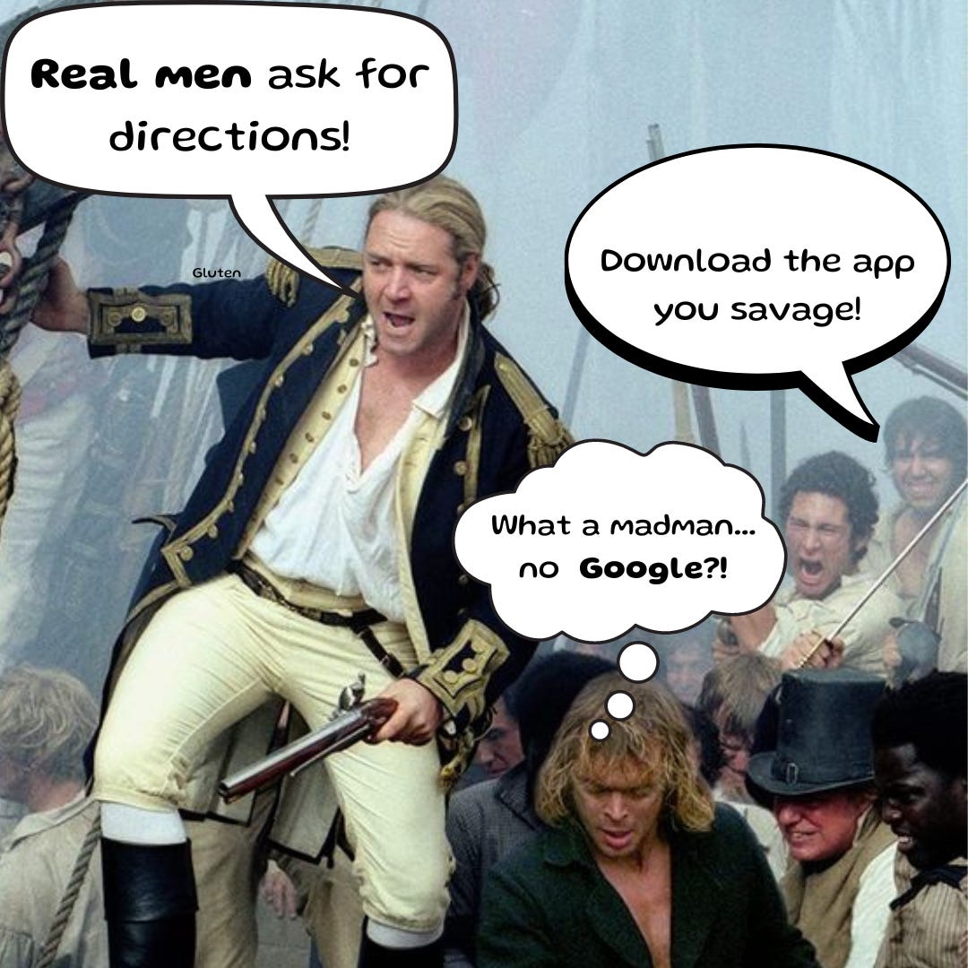 Not having Mr. Google tell you how to get places not only builds confidence in your own inner Master and Commander, but your memory of everything increases as a result as well. I can recall people’s phone numbers, and my own passwords, with little issue.