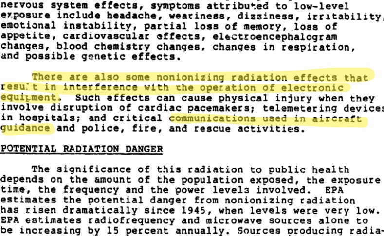 As far back as 1978, the EPA warned against wireless radio signals interfering with aircraft communications, along with harmful biological effects in a report entitled “Efforts by the Environmental Protection Agency To Protect the Public from Environmental Non-ionizing Radiation Exposures”: