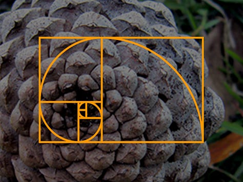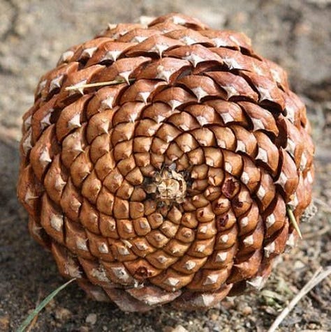 The spiralling shape of the pine cone adheres to the Golden Ratio, a number that shows up all over nature and wherever there is growing life.
