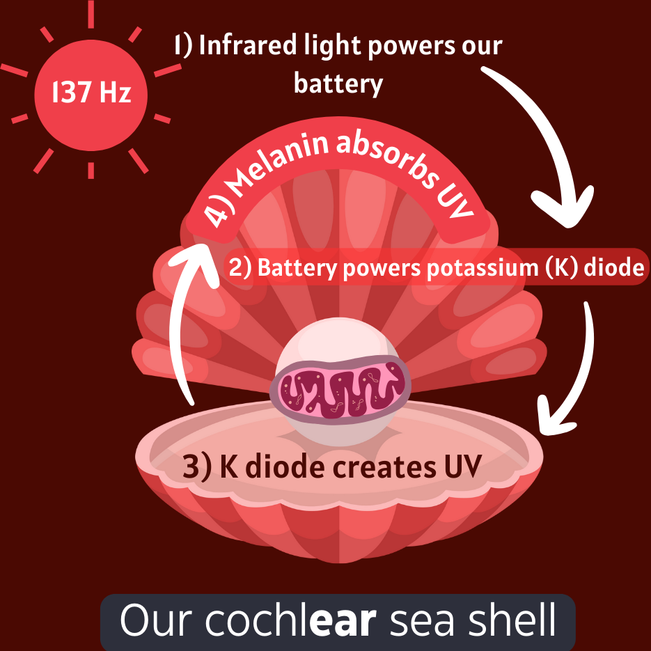 Sunlight powers our battery of mitochondria, causing a spark of electricity that the potassium (K) in the fluid of our inner ear uses to create UV light.5 Melanin then uses this light for crucial metabolic reactions such as fighting cancer and inflammation.