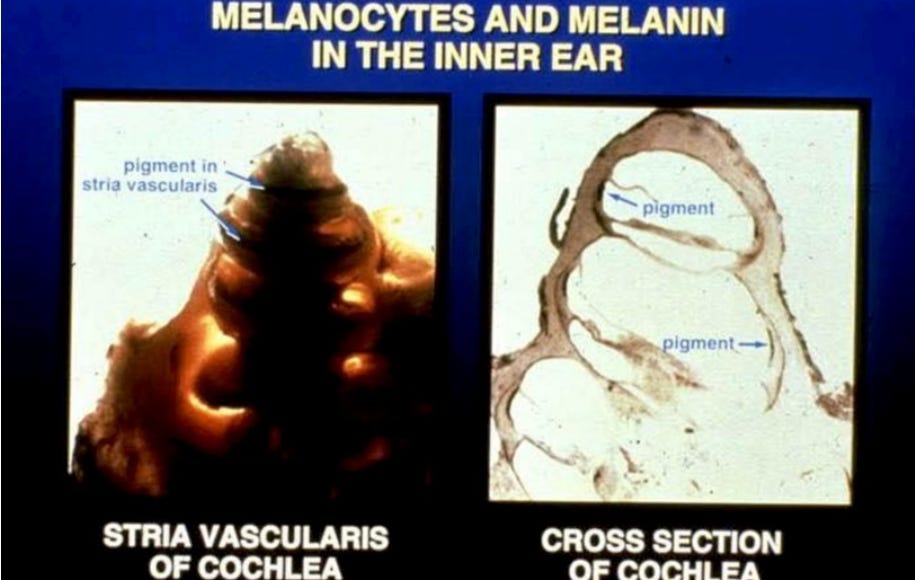 The more UV we are able to absorb, the more melanin we build on our cochlear sound-proofing surface, which houses our sound-processing system.