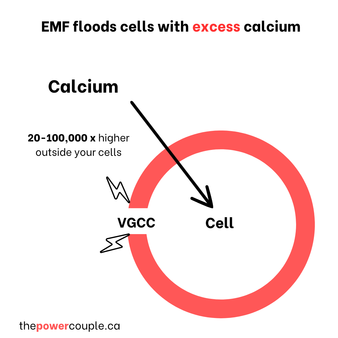 In 2013, Pall reviewed 26 studies on calcium and concluded that EMFs activated these VGCCs after about five seconds, flooding the inside of the cell with an unhealthy amount of calcium ions at a rate of about one million per second.