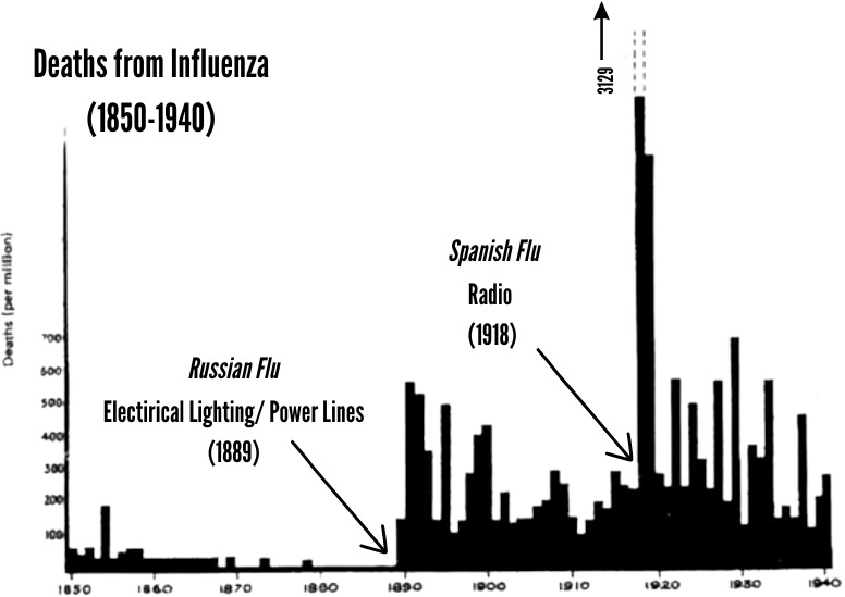 In 1889, the Age of electricity was born, as Edison and Tesla provided electricity and light on a global scale. That same year, the magnetic activity of Earth began to be suppressed. The Russian flu pandemic of 1889 arrived as power lines began to radiate our atmosphere.