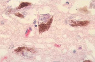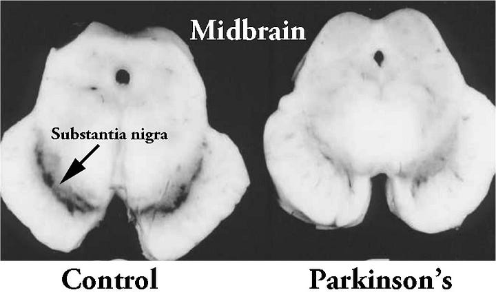 Dopamine neurons in the human brain produce so much neuromelanin that we can visualise it with our naked eye. As we can see in the image below, the Parkinsonian brain has less dark pigmented cells (in the substantia nigra region of the midbrain) below. As dopamine neurons – which are affected in Parkinson’s – are lost, so too is the dark pigment of neuromelanin.
